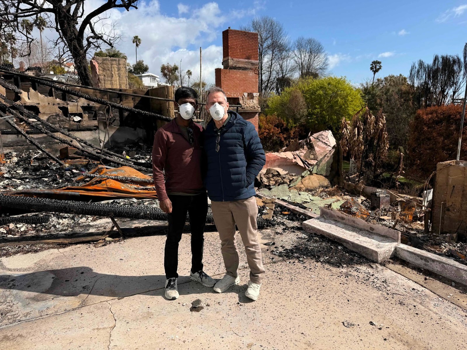 Bevel founders Aravindh Dorai and Adam Freed at the site where Adam’s childhood home burned down